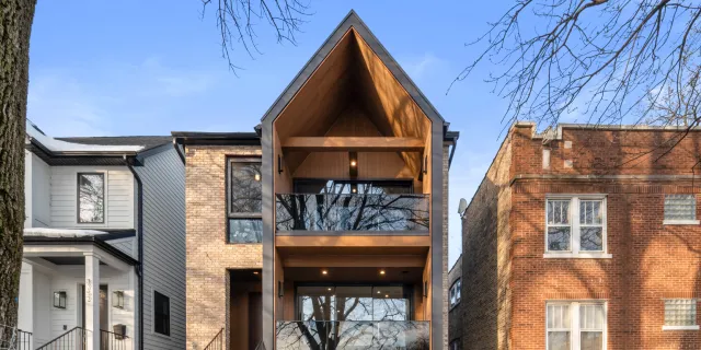 Modern Swiss-chalet-inspired façade with steep gable peak, warm wood-lined terraces, glass balcony rails, and expansive windows. Timeless brick grounds the design, while crisp metal detailing emphasizes a bold, light-filled vertical volume.