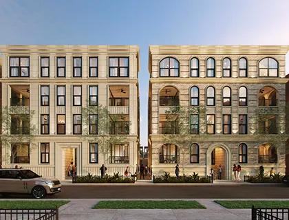 Contemporary infill with pale brick piers and recessed glass balconies; a refined vertical rhythm contrasting neighboring masonry. Inside, warm oak, honed stone, and globe pendants deliver calm, tailored modernism within.
