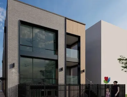 Contemporary two-story residence with light-gray siding, black-trim windows, and a simple gabled roof. Elevated entry stair and metal railings face a fenced front yard, fitting neatly between urban neighbors today